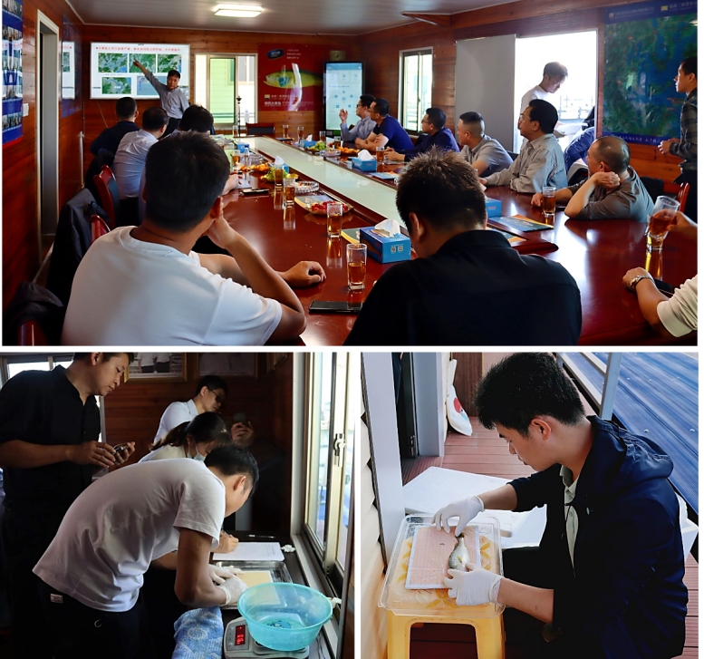 验收专家现场察看了大黄鱼养殖情况,查阅了相关记录,根据生产记录和投饵量等估算了各组网箱(16m×16m×8m)中当前的存鱼量,并对4个选育组和2个对照组进行随机抽样和生长性状测量。结果显示,采用基因组多性状复合选择技术选育的“速生抗病耐粗饲”组、“速生多抗”组及其与“甬岱1号”大黄鱼正反杂交组(2022年2月18日产卵),生长速度和养殖成活率都高于“闽优1号”对照组,其中尤其是针对体重生长、抗内脏白点病和对无鱼粉无鱼油饲料适应性进行了基因组复合选择的“速生抗病耐粗饲”组,其生长最快,通过敲击网箱踏板、然后随机捞取上游到水面的30尾大黄鱼平均体重(105.27g)比公司提前48天繁育、在同一渔排同样规格网箱中养殖的对照组(73.31g,2022年1月1日产卵)高43.6%,成活率高17%(45% vs 28%,相对提高60.7%);针对体长生长、抗体表白点病、抗内脏白点病和抗白鳃病进行了基因组复合选择的“速生多抗”组,平均体重(81.19g)比上述同样对照组(73.31g)高10.7%,养殖成活率高22%(50% vs 28%,相对提高78.6%);2个杂交组生长和存活率也都显著高于对照组。各个选育组生产性能优势都很明显。专家组一致肯定了项目组的工作,认为多性状复合基因组选择是选择育种技术的重要发展方向,项目组大黄鱼基因组选择育种技术研究走在国内前列,研发的技术值得加以推广应用。并建议对4个选育组进一步进行比较观察,然后对效果最好的选育组在进行进一步选育的同时,加快应用转化,促进大黄鱼养殖产业提高养殖效益。