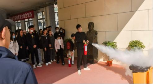演练前,集美大学资产与设备管理处林亚梅副处长首先强调了实验室安全的重要性,要求老师和同学必须从思想上和行动上统一,切实做好实验室安全管理工作。接着,集美大学测试中心的邹志华老师演示了危化品的泄露的处置,同学们全程进行了学习。最后进行了火情发生逃离实验室的演练,演练结束后保卫处工作人员进行灭火器实操示范,并让学生代表进行操作演示。