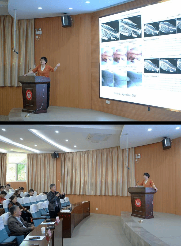 周莉研究员主要从事鱼类多倍化与生殖方式转换机制和多倍体育种技术研究。在报告会上,她分享了自己的研究经历,详细介绍了多倍化存在的优势与劣势,以foxl2、viperin、lrp2a、oca2和runx2b基因为例,系统揭示了多倍体鱼类重复基因的进化命运;介绍了联合基因编辑、高效繁育、人工雌核生殖和性控育种技术,建立多倍体鱼类快速精准育种的技术路线。报告结束后大家进行积极地提问和讨论,现场气氛活跃,学术氛围浓厚,在场的老师和学生通过参加报告会,进一步开阔了学术视野。