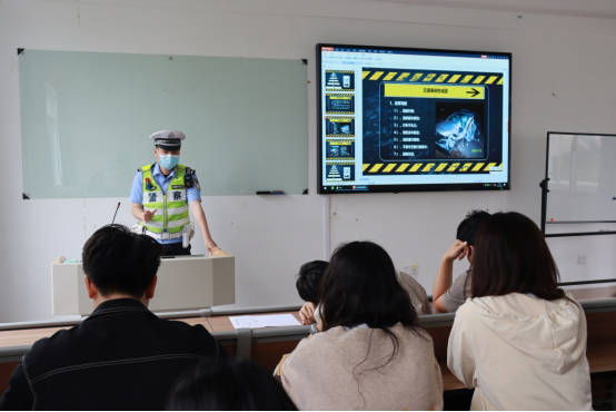 讲座上杜警官从交通安全法规、交通安全常识两方面出发,结合大量实际案例讲述了交通安全的重要性及注意事项。讲座后,杜警官与学生代表进行座谈,就学生关心关切的交通法规与安全方面疑问逐一解答并教育同学们要提升交通安全意识与法律意识,文明出行,安全交通。