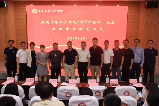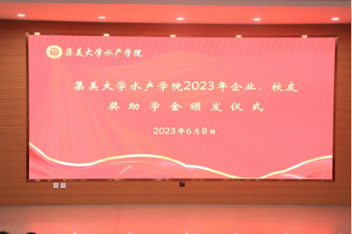 6月8日,水产学院2023年企业、校友奖助学金颁发仪式在水产综合楼一楼报告厅举行。水产学院党委书记黄海宏、院长张春晓、副院长黄文树、姜永华,大北农华有水产科技集团创业人才副总监孔庆雨、福建事业部海特公司总经理王晓东、福建区创业人才经理黄章富、人事经理牟红梅,广东联鲲集团助理总裁刘名超,集美大学水产行业校友会副会长王彦锋、宋志忠、秘书长齐涛等领导嘉宾及获奖学生代表参加颁奖仪式。仪式由学院党委副书记黄庆胜主持。