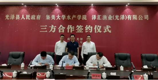 10月24日,光泽县政府、集美大学水产学院、泽汇渔业(光泽)有限公司在光泽县政府会议室举行三方合作签约仪式,光泽县县长王贵、副县长钟淮钦、集美大学水产学院院长张春晓、副院长姜永华、副院长黄文树、泽汇渔业董事长陈乃晶、总经理谢军及相关人员出席。