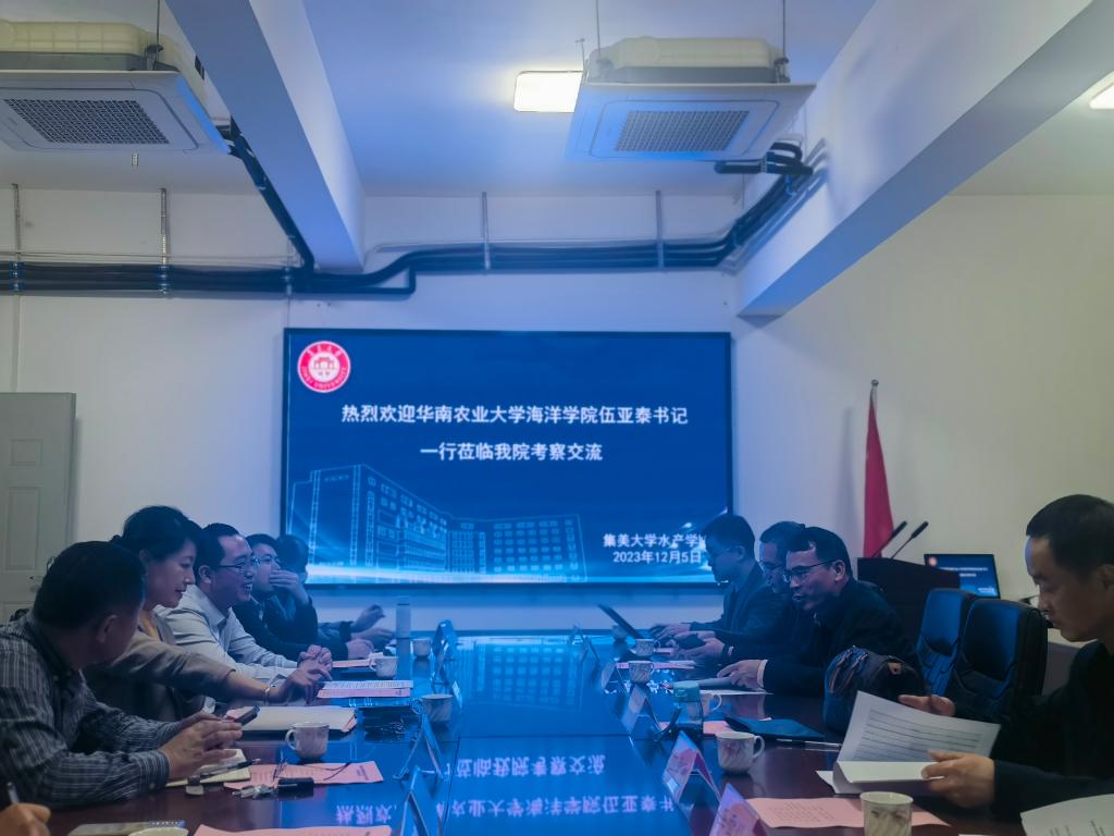 12月5日,华南农业大学海洋学院党委书记伍亚泰一行六人来水产学院调研、交流。水产学院院长张春晓主持会议并致欢迎辞,华南农业大学海洋学院党委书记伍亚泰介绍随行人员,双方就本科专业人才培养及建设成效等方面取得的成果和经验展开交流。