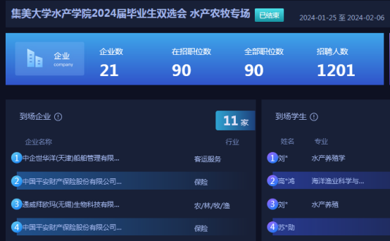 本次双选会在智联招聘网上举行,共有21家单位参与,历时13天,招聘人数1200人,涵盖水产、生物技术、航运、教育、保险等行业岗位数90个。