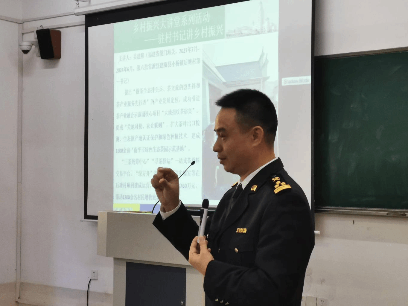 为加强研究生课程教学方式改革,提高课程教育教学质量,11月28日,水产学院邀请了两位时任福建省第六批省派驻村的书记,为2024级渔业发展专业研究生展开了一场生动活泼的课堂教学。林雄喜书记(华安县华丰镇良埔村第一书记)和吴建隆书记(驻建瓯县小桥镇后塘村第一书记)结合《现代农业创新与乡村振兴战略》的课程特点,围绕乡村振兴战略,分别介绍了他们任职三年来开展的关于基层党建、村容治理、农旅结合、产业发展、农民增收致富等驻村工作经历,分享了他们的工作心得、经验、成果和快乐。