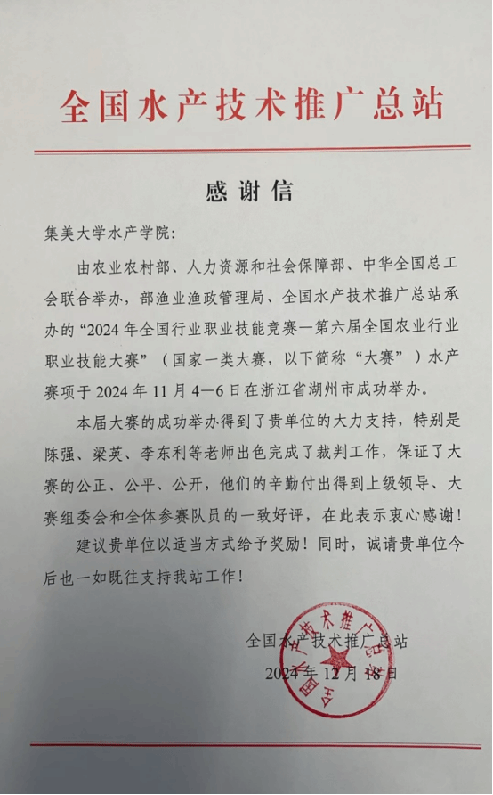 近日,全国水产技术推广总站向我院发来感谢信。来信中,全国水产技术推广总站对我院给予的大力支持表示感谢,并对陈强、梁英、李东利3位老师出色完成了“2024年全国行业职业技能竞赛——第六届全国农业行业职业技能大赛”裁判工作,保证了大赛的公平、公正、公开,表示感谢。