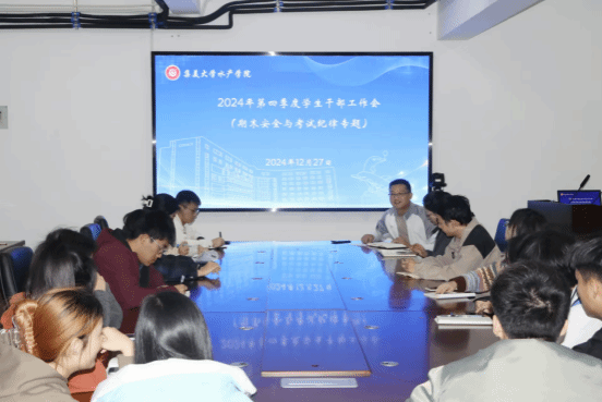 近日,水产学院召开专题工作会议,重点开展迎接本科教育教学审核评估再动员及期末安全、考试纪律相关工作布置。会议由学院党委副书记苏文土主持,学院团委书记王鹏、各年级辅导员以及班级主要学生干部参加会议。