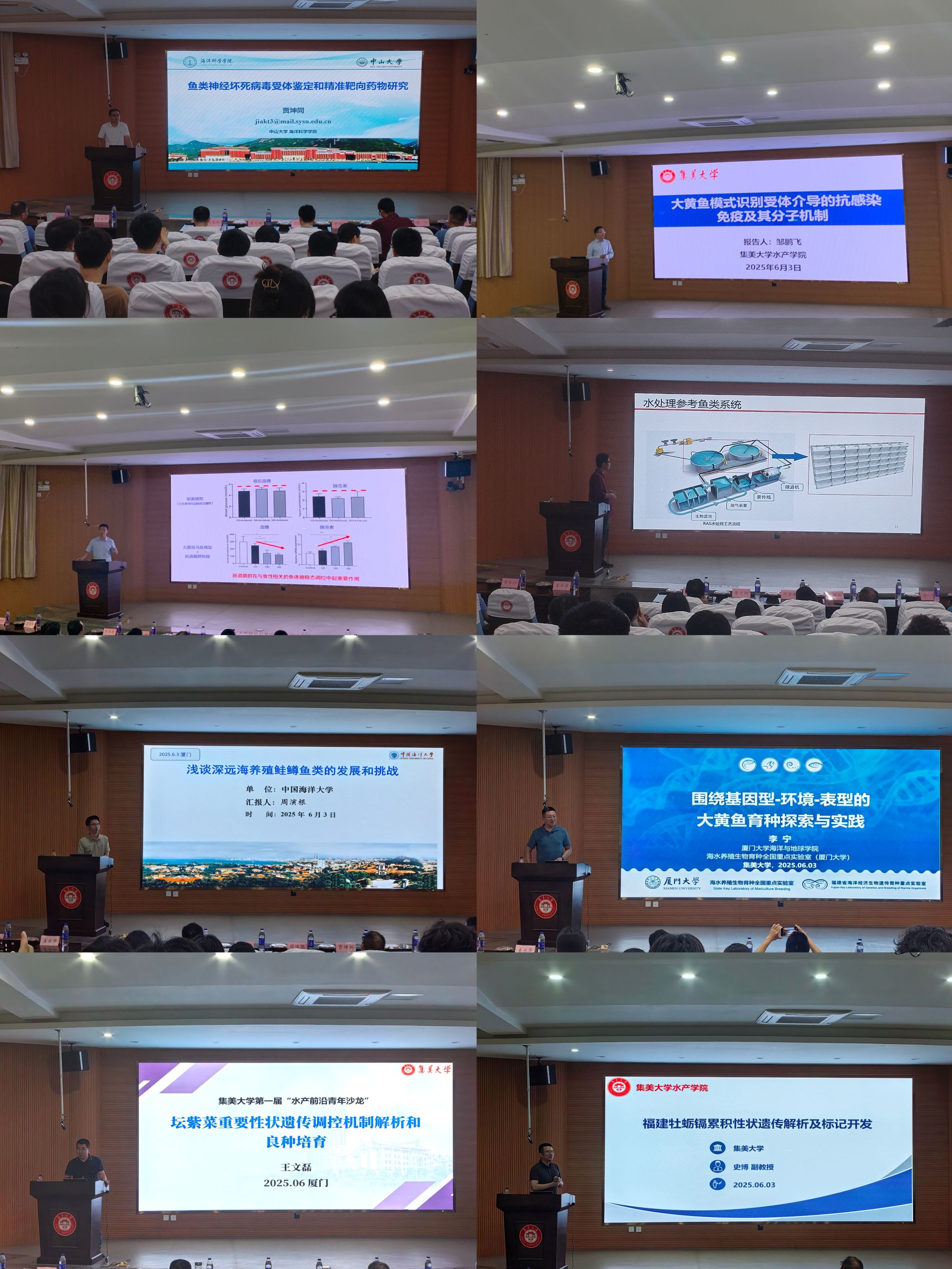 开幕式上,张春晓发表致辞,期待青年学者以开放视野聚焦行业痛点,为水产科研注入年轻化、多元化的创新动能。沙龙设置主题报告环节,8位青年学者围绕水产养殖、病害防控、遗传育种等领域分享最新研究成果。中山大学贾坤同教授、中国农业科学院饲料研究所冉超研究员、宁波大学史策教授、中国海洋大学周演根教授、厦门大学李宁副教授、水产学院王文磊教授、邹鹏飞副教授、史博副教授分别做了题为“鱼类神经坏死病毒受体鉴定和精准靶向药物研究”、“鱼类肠道鲸杆菌与宿主互作机制研究”、“关于工厂化循环水养殖系统微生物管理的一些思考-以海水蟹为例”、“浅谈我国深远海鲑鳟鱼类养殖的发展和挑战”、“围绕基因型-环境-表型的大黄鱼育种探索与实践”、“坛紫菜重要性状遗传调控机制解析和良种培育”、“大黄鱼模式识别受体介导的抗感染免疫及其分子机制”以及“福建牡蛎镉累积性状解析及标记开发”的精彩报告。报告中,学者们结合研究数据与产业案例,深入剖析学科瓶颈,并与现场师生展开热烈讨论,形成良好的互动氛围。