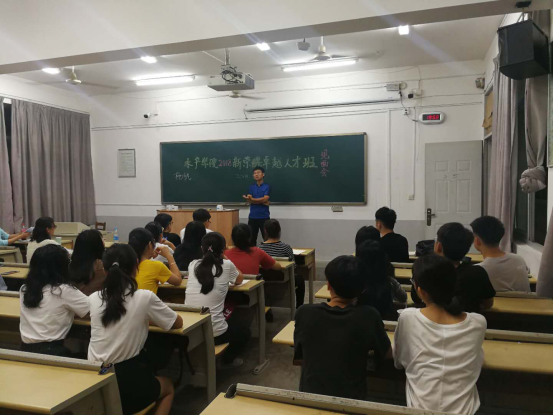 2018年5月6日晚,水产学院举办2018年新荣腾卓越人才班开班仪式。校内班主任王国栋老师、企业班主任杨帆校友、新荣腾人事负责人陈远燕、新荣腾实习生黄亮,以及全班25名新学员参加了开班仪式。