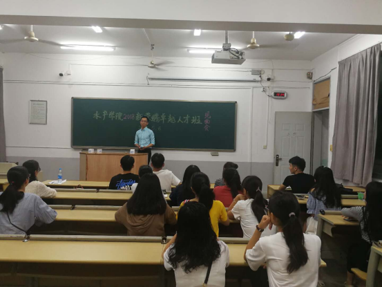 仪式共有三个环节:首先,初次见面自我介绍。不论年级、专业和班级的同学们在活跃的气氛中介绍了自己的基本情况,并希望在新班级中和新同学们成为好朋友,互相学习。随后,王国栋老师作了关于“品德与理想”的演讲,通过自己在校期间的实例和自己求学、踏上教学道路的经历,让同学们深切感受到做“品德好”、“有理想”的“人”的重要性,并推荐给大家一本书——《人类简史》。最后,杨帆通过点评大家填写的卓越班申请表,解释了对申报学生的挑选规则,并通过讲述自身求学和就业中的实例,建议大家今后在做事情时,多思考出更多的可能性,尽量对每一个细节“认真”,因为我们永远不知道所面对的人或事会在哪个细节上对我们“较真”。仪式后,班级还选举班长——养殖1612 张乐。