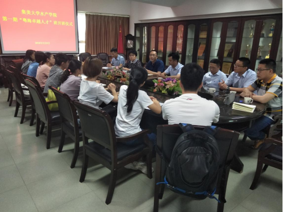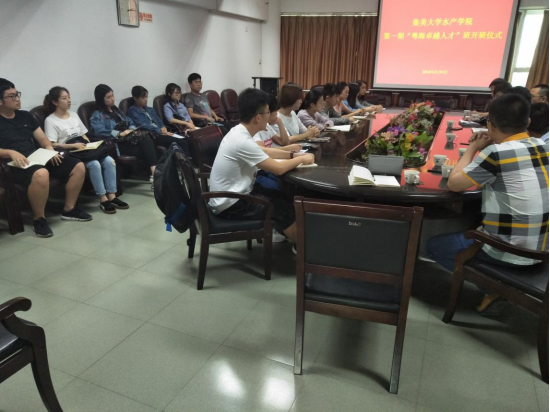 2018年5月9日下午,水产学院举办2018年粤海卓越人才班开班仪式。副院长张春晓、郭玉清,党委陈延童副书记,福建粤海饲料有限公司郑真龙总经理,校内班主任鲁康乐老师、企业班主任汤树兵校友、人事部部长张建强、虾料配方师王世英,以及全班17名新学员参加了开班仪式。