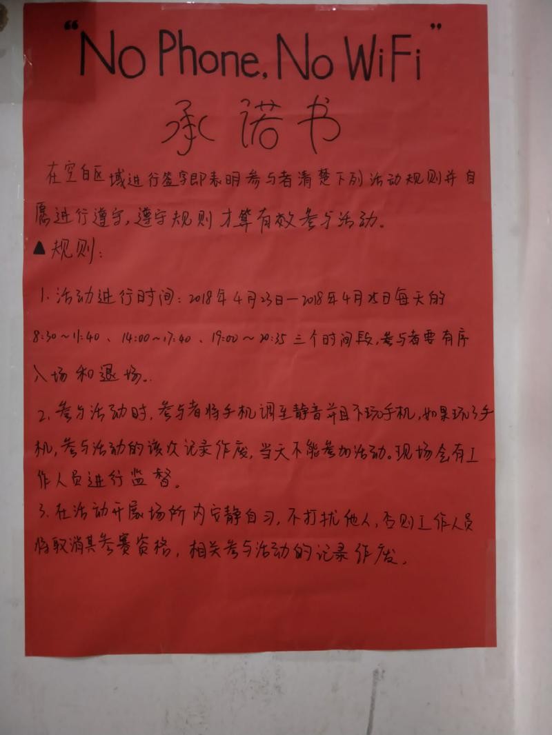 为了鼓励同学们放下手机,离开网络,挑战自控力,创建良好的校园文化环境,营造浓郁的读书氛围,4月23--25日,在水产学院科技楼四楼阅览室开展了“No phone, No wifi”断网日活动。