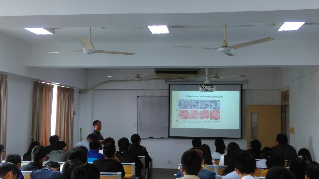 报告会上,刘教授介绍了Kisspeptin基因的信号系统及Kisspeptin基因在金鱼生殖调控中的作用,展示了雌激素对金鱼Kisspeptin基因表达的影响和运用TALENs技术对斑马鱼Kisspeptin及其受体基因进行敲除的实验。刘教授还就自己鱼类方面的研究进行了总结,与高等哺乳动物相比鱼类生殖调控弹性大,Kisspeptin基因有调控作用,但并非必不可少。