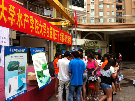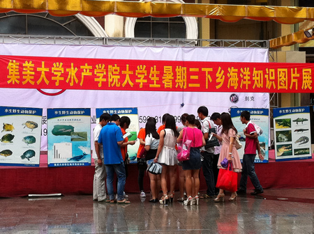 为了在基层推广水产养殖新技术、普及海洋保护知识,2013年7月15日下午,集美大学水产学院“水产梦”养殖技术推广与调查服务队在漳浦县城新华都广场开展海洋知识图片展。共展出展板60块,介绍虾苗培育技术4种,水质管理技术6种,病害防治技术20种,以及水生动物保护品种86种。