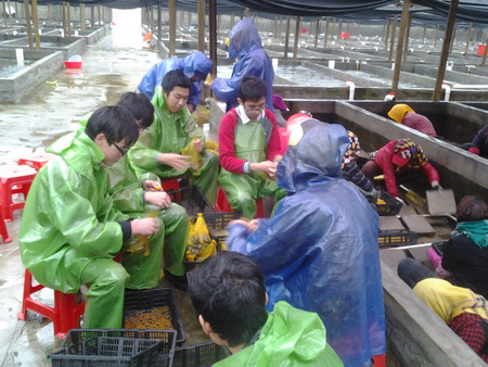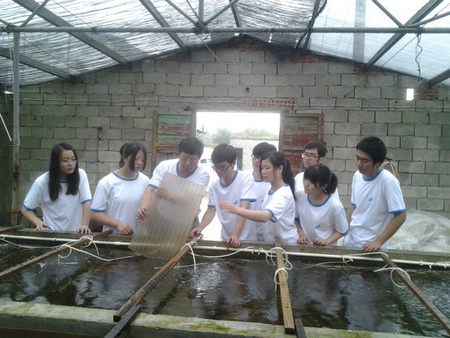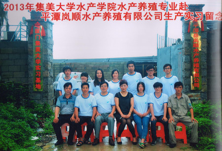 平潭岚顺水产有限公司是一家具有一定规模的鲍苗场,自与水产学院建立产学研实习基地后,今年首次主动接受水产学院水产养殖专业学生开展人工培育鲍苗生产实习。学生们直接参与了亲鲍培育、催产、采苗、基础饵料培养、日常的鲍苗投饵、水环境管理和鲍苗销售等生产环节。通过生产实习,学生比较全面掌握了鲍苗的人工培育技术,培养了吃苦耐劳的敬业精神,并与该场生产业者们建立了深厚友情。
