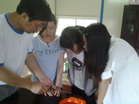 宋振荣教授指导实习学生观察附板鲍苗(服装由岚顺水产有限公司赠送)