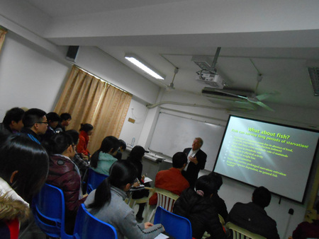 应水产学院水产生物技术课题组的邀请,加拿大皇家科学院院士,加拿大哥伦比亚大学终身教授David J. Randall来我校访问。1月16日下午,Randall教授给水院师生做了题为“缺氧、饥饿和繁殖对鱼类基因表达的影响”的学术报告。报告过程中,Randall教授比较了哺乳动物和鱼类应对饥饿的不同策略,探讨了鲤鱼肝脏和肾脏饥饿或缺氧不同时间后基因表达的变化。水产学院研究生,部分本科生和教师参加了Randall教授的报告,详实的数据,生动有趣的阐述,深深吸引了同学和老师,开阔了大家的研究思路。