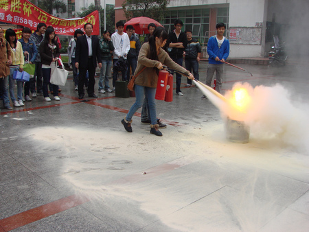 讲座结束后,学院组织师生到第九餐厅前广场进行现场灭火演练。在金科长细心的指导下,师生代表们认真领会,依次有序地操作,学会了正确使用灭火器,大家纷纷表示收获很大。