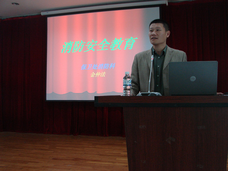 近日,我院邀请校保卫处消防科金仲法科长为学院师生作消防安全教育讲座,讲座由院党委副书记郁军态主持,学院实验室全体老师、学生宿舍长参加了讲座。