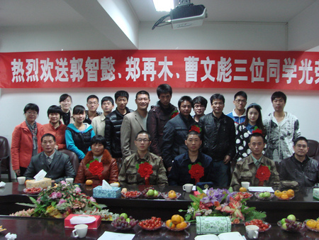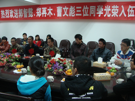 “一人参军,全家光荣,全校支持”。水产学院郭智懿、郑再木、曹文彪同学在2012年冬季征兵中顺利通过选拔,即将奔赴军营。这是水产学院继2011年2位同学入伍之后,又一批同学响应号召,光荣应征。11日下午,水产学院在水新综六楼第一会议室举行欢送座谈会。院党委副书记郁军态,校武装部庄越明、院教学秘书李丹、养殖1011班导师谢仰杰、渔科1111班导师翁朝红,以及三位入伍同学的家长和同学代表出席了座谈会。
