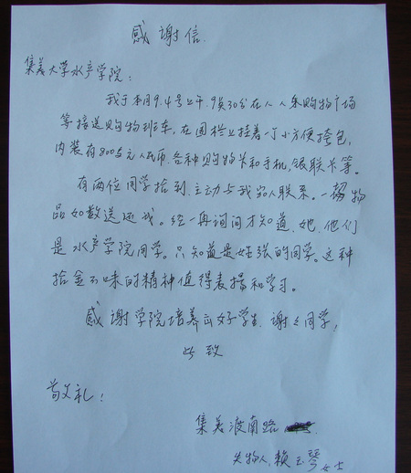 9月4日,水产学院两名同学在人人乐购物广场拾到赖女士挎包一个,内有800元现金、各种购物卡、银联卡和手机等物品。两名同学及时与失主联系,归还物品后却始终不愿意留下自己的姓名。经过多方打听联系,9月6日上午,失主赖女士给学院送来感谢信,感谢两位同学,感谢学院对学生的教育与培养。两位同学这种拾金不昧,做好事不留名的精神体现了集美大学的诚毅品格,更是当代青年雷锋精神的传承。
