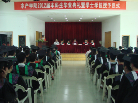 6月13日,水产学院举行2012届本科生毕业典礼暨学位授予仪式。校党委常委、副校长关瑞章、院党政领导、院中层干部、毕业班学生导师及全体毕业生参加典礼。院党委副书记郁军态主持毕业典礼。