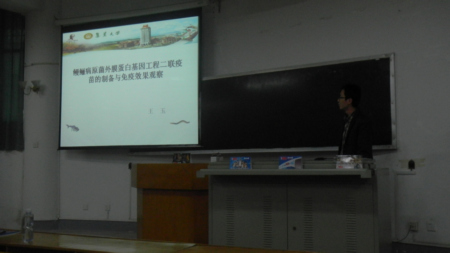 随后,王玉、操龙飞、杨洁同学分别做了关于《欧洲鳗鲡病原菌外膜蛋白基因工程二联免疫苗的制备与免疫效果观察》、《一种海鲜风味料的呈味及挥发性成分分析》、《外部环境因素诱导鱼类性分化的研究》的报告。曹媛钰同学结合自身经历,对如何规划研究生阶段的学习提出建议,并与同学们分享撰写外文论文的经验。精彩的报告演说,新颖的研究思路,创新的科研技术,调动在场研究生的参与热情,大家踊跃提问,相互交流、学习。此次学术论坛在轻松、融洽的氛围中圆满结束。