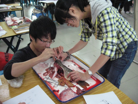本次比赛为三人组队、团体合作的形式,吸引了全院各年段学生,同学们踊跃报名,共有二十六组同学参加。比赛以鲤鱼为解剖材料,评比内容包括活体解剖以及绘图。比赛现场气氛十分热烈。活体解剖环节中,选手们熟练地操作着手中的器材,仔细观察着鲤鱼内部结构,细剪慢挑,不时地与队员交流,配合默契;在解剖的同时,还需对鲤鱼内部结构进行绘图,注明各个器官、系统的名称并对其特征进行分析。最终,来自09级动植物检疫专业的高瞻、李小梅、王业创三位同学以熟练的解剖手法以及深厚的绘图功底得到了评委老师的肯定,获得了一等奖。
