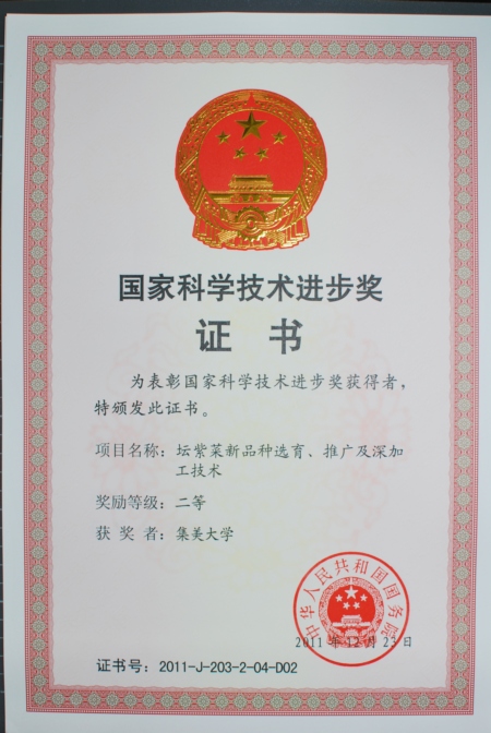 2012年2月14日,中共中央、国务院在北京隆重召开国家科学技术奖励大会,我院陈昌生、谢潮添等老师参与的“坛紫菜新品种选育与推广及深加工技术”(集美大学排名第二)成果获得国家科技进步二等奖。该成果首次阐明了坛紫菜的三大基础遗传学问题,对坛紫菜种质遗传多样性分析、种质自动化鉴定、种质保存、诱变育种、杂交育种和分子辅助育种等技术进行了集成创新,建成坛紫菜种质库2个,保存和培育了坛紫菜新品种,并在厦门、福清、泉州、宁德、浙江、广东等地进行大规模推广,取得了显著的经济、社会效益;建立了坛紫菜良种制种中心4个,支持企业建设国家级坛紫菜良种场1个,省级坛紫菜良种场2个,有力地促进了坛紫菜良种的大规模推广;突破了坛紫菜深加工技术,解决了鲜菜保存、去沙清洗、供菜与菜饼剥离等多项关键技术,研制出6大类20多种深加工产品,并实现了产业化生产,产品附加值提高到200%以上,经济效益增加十分显著,促进了产品更新换代。该项目在紫菜育种技术和新品种的性能指标上达到了国际领先水平,其研究成果结束了我国坛紫菜栽培无良种、加工靠日晒的历史,为该产业可持续发展提供了可靠的技术支撑。
