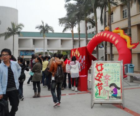 3月7日,院学生会女生部将女生宿舍区装饰一新,浪漫的气球加温馨的小贴士,让女生们感到了节日的气氛。3月9日下午,九餐门口又摆起了“女生街”: 在DIY区,手工协会的同学们现场教授女生们手工技巧;在二手货物交换区,女生们可以互换自己心爱的物品;在展示区,主题为“最美瞬间的你”的女生照片,引得众人驻足观看。