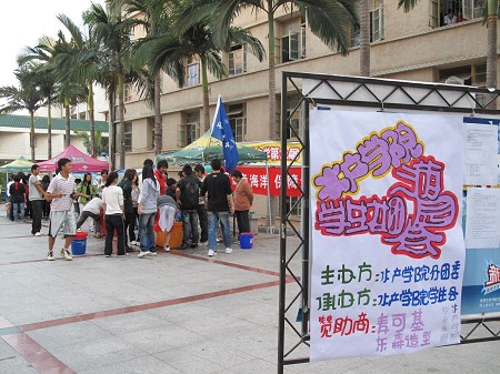 为了丰富同学们的课余生活,展示各社团的风采,2009年11月25日下午,水产学院社团联合部在第九餐厅前广场举办了社团游园会。