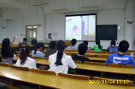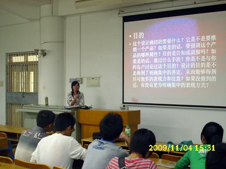 小璐老师先通过一系列具有创意的图片和特色的设计激发同学们的兴趣,然后结合自身的经验和社会的需求生动讲解了设计的标准。讲座寓教于乐,现场气氛轻松活跃。