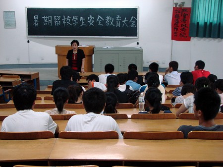 会上,颜素芬结合许多实际生活中的案例,在人身安全、水电安全、财产安全、交通安全、食品安全、游泳安全和组织纪律性等方面对留校同学进行了安全教育,特别强调同学们注意防范甲型H1N1流感,在关心政事、时事的同时,要明辨是非,共同维护校园和社会的安全稳定,在暑期兼职过程中要提高辨别能力和树立起自我保护意识。同时,对暑假各住宿楼的值班与护校工作作了详细安排。最后,颜素芬也叮咛同学加强与值班老师的联系,及时上报有关信息,希望同学们互相关心,互相帮助,共度一个温馨、祥和、充实的暑假。