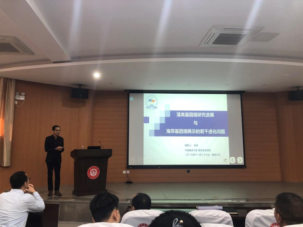聘任仪式上,张春晓院长介绍了刘涛教授的个人简历以及在水产学科领域的科研学术业绩,谢潮添副校长为刘涛教授颁发兼职教授聘书,佩戴校徽。聘任仪式后,刘涛作了题为“藻类基因组研究进展与海带基因组揭示的若干进化问题”专题学术报告,介绍了藻类基因组的研究进展、藻类基因组揭示的基本遗传学问题以及海带核心代谢通路及其反映的进化机制,并就藻类基因组研究面临的挑战及热点进行了总结与展望。水产学院近百名师生聆听了报告。
