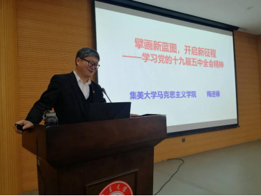 12月30日下午,马克思主义学院梅进禄副教授为水产学院全体教职工作题为“擘画新蓝图,开启新征程——学习党的十九届五中全会精神”辅导报告。