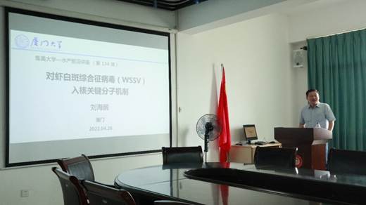 刘海鹏教授聚焦水产甲壳类免疫基础及应用工作,在对虾上的开展了丰富的研究。中国是世界最大对虾养殖国,虾产业可持续发展仍遭受病害影响。白斑综合征病毒(WSSV)是目前危害最大的对虾病毒性病原,造成的损失每年达数十亿以上,目前仍未解决防治问题。此次,刘海鹏教授带来了题为“对虾白斑综合征病毒(WSSV)入核关键分子机制” 的学术报告,分享了其课题组在WSSV侵染过程中内化入胞、胞质内运输,脱囊膜、核衣壳释放基因入核、新合成结构蛋白入核机理及子代组装等系列上的研究成果,揭示了WSSV的侵染机制,为WSSV防治提供重要依据。