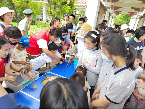 图一集美大学“守鲎”团队的志愿者们通过标本向群众介绍鲎的相关知识