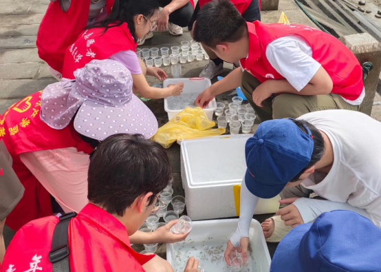 图二水产学院“守鲎”团队的志愿者分发鲎苗