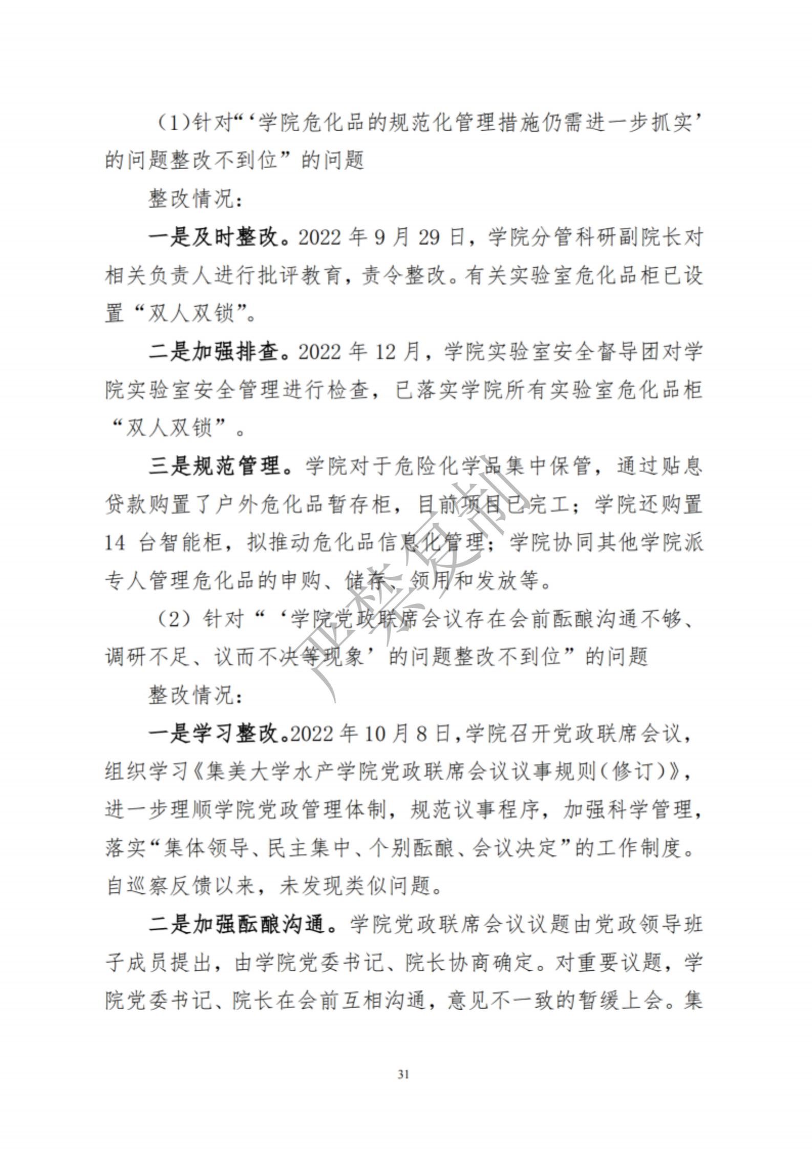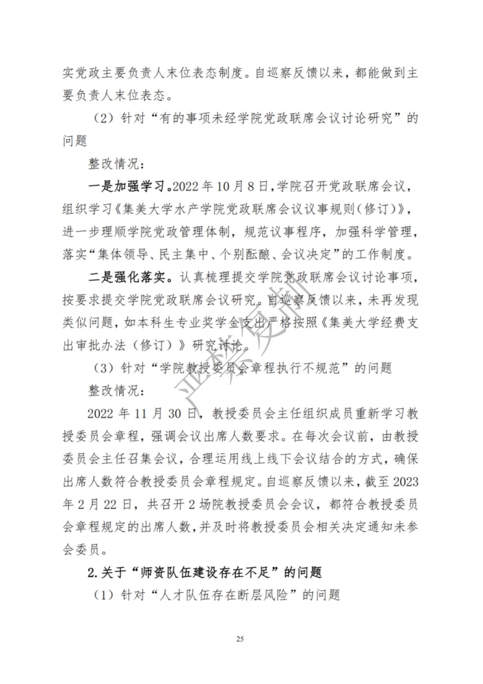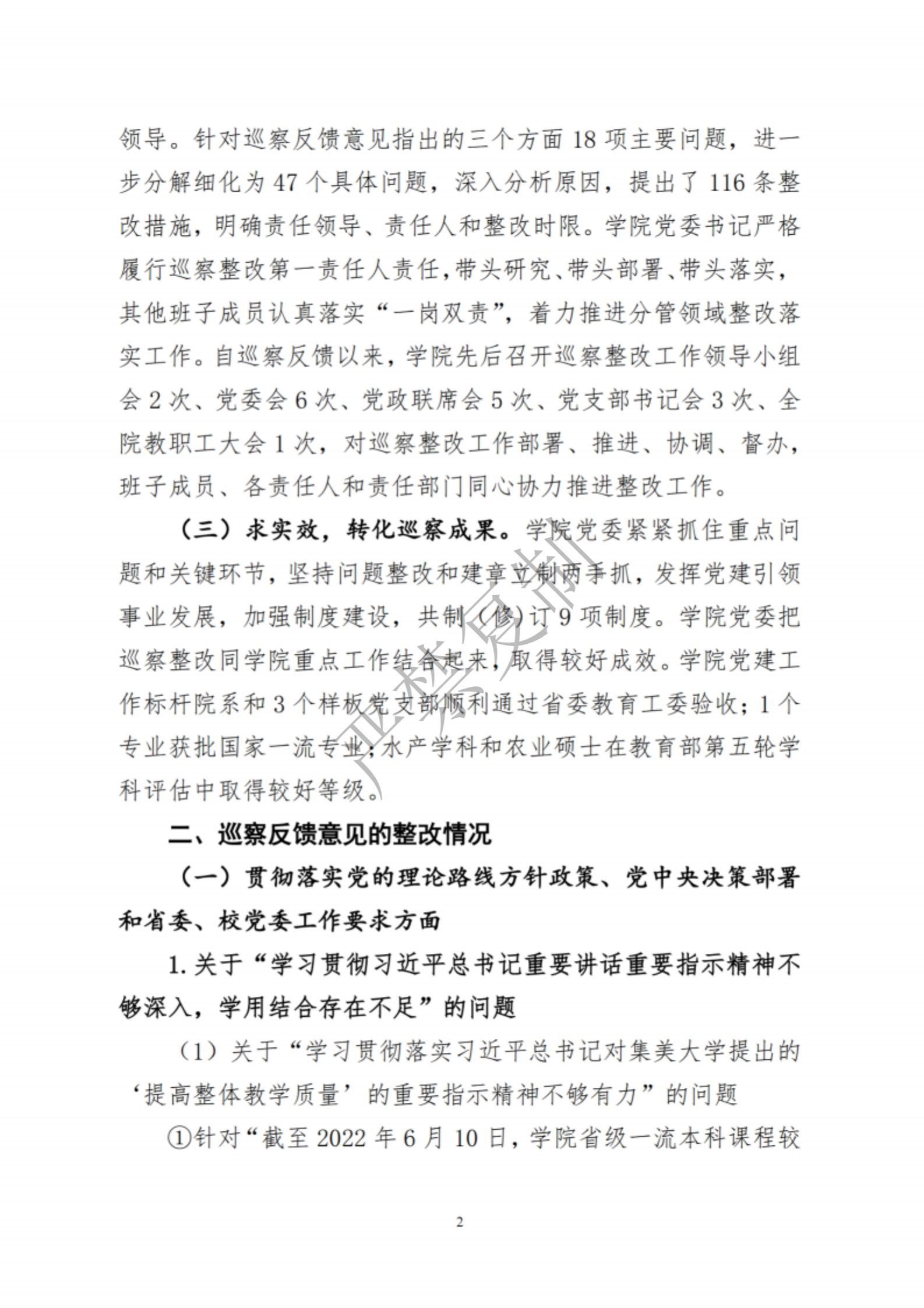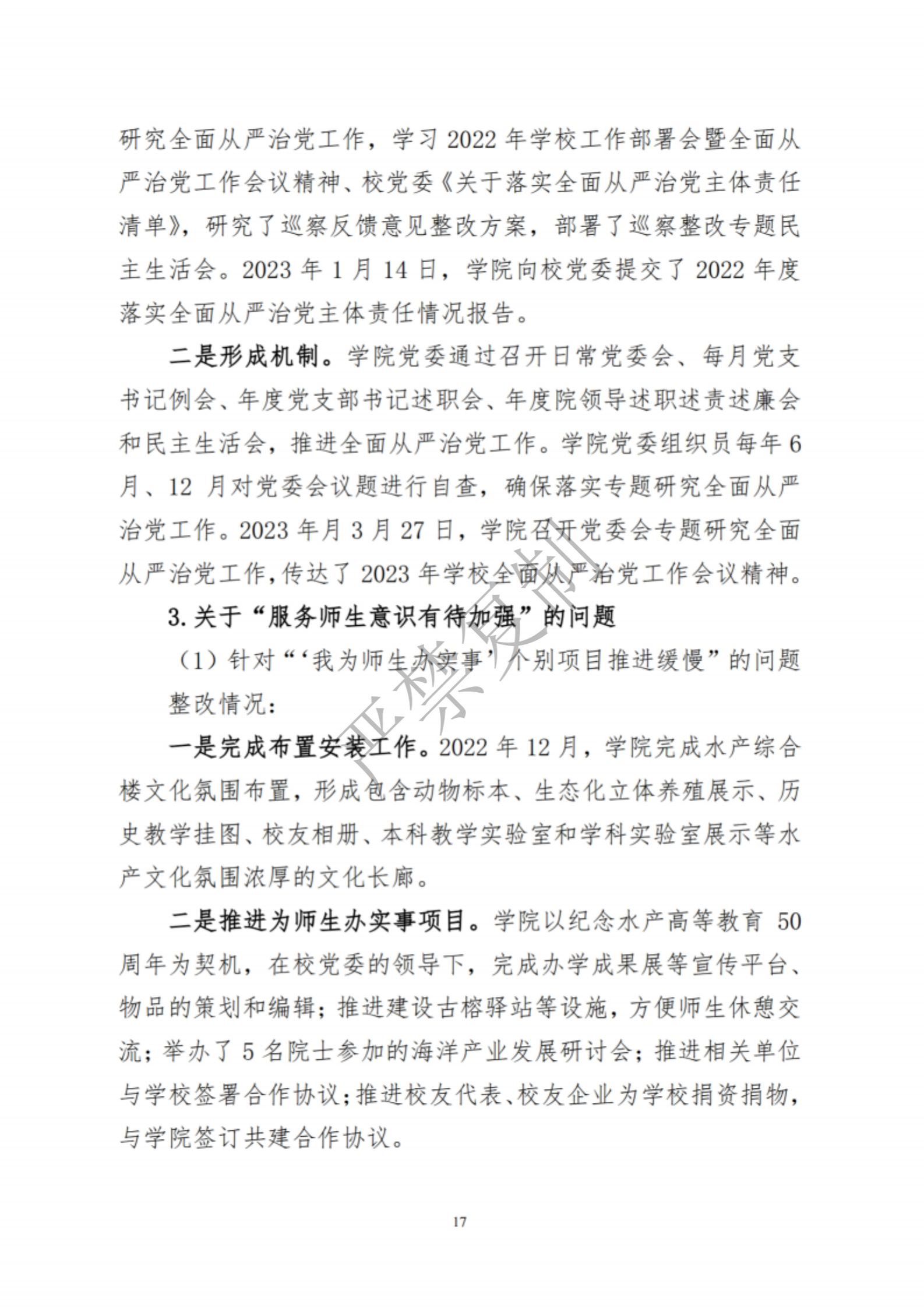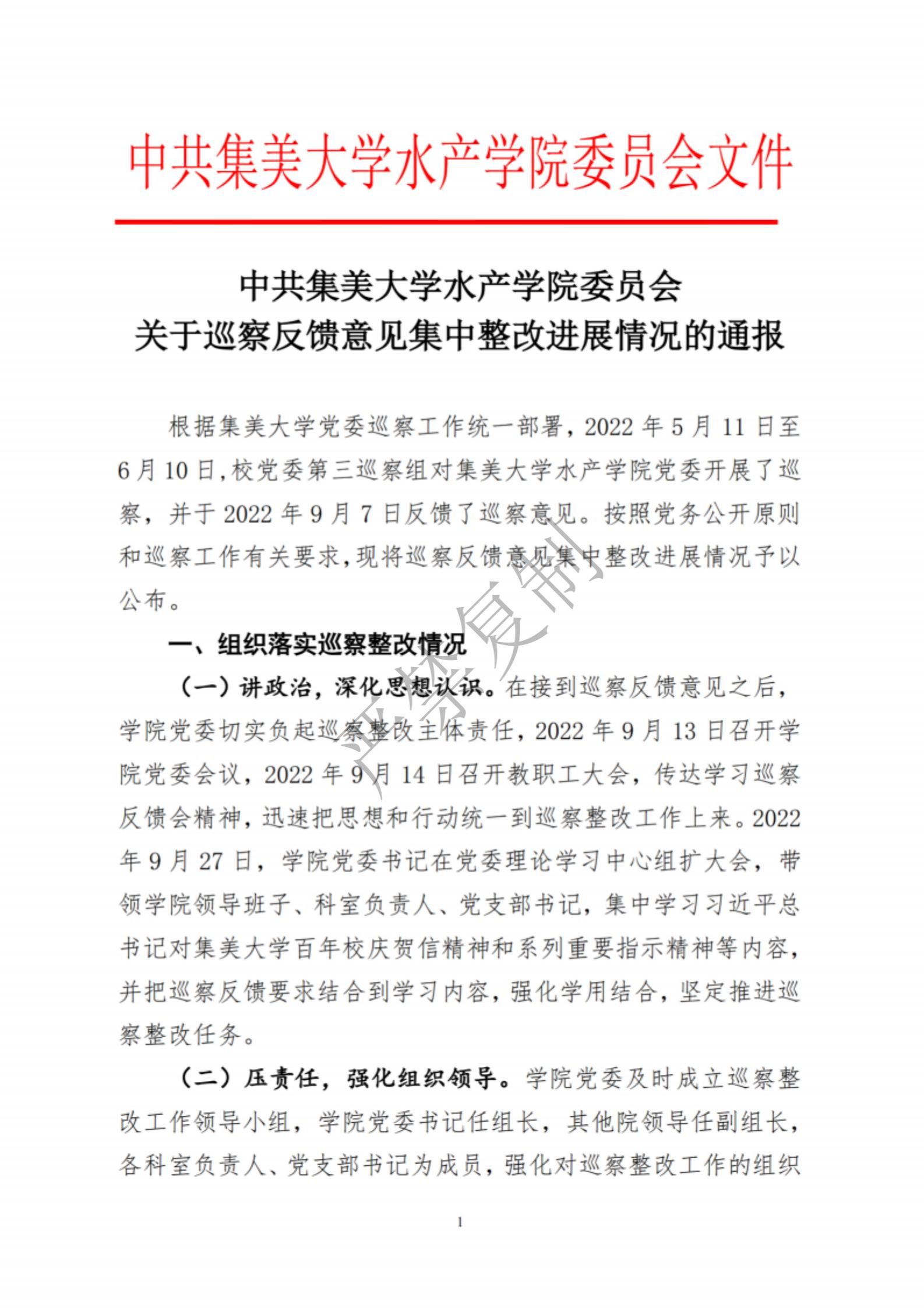 中共集美大学水产学院委员会关于巡察反馈意见集中整改进展情况的通报