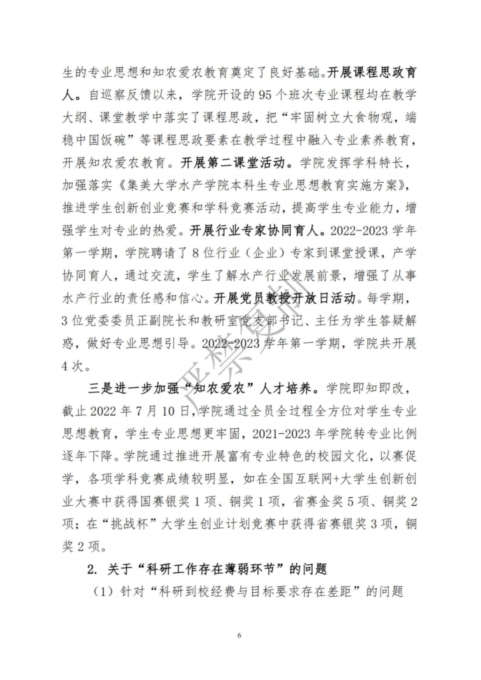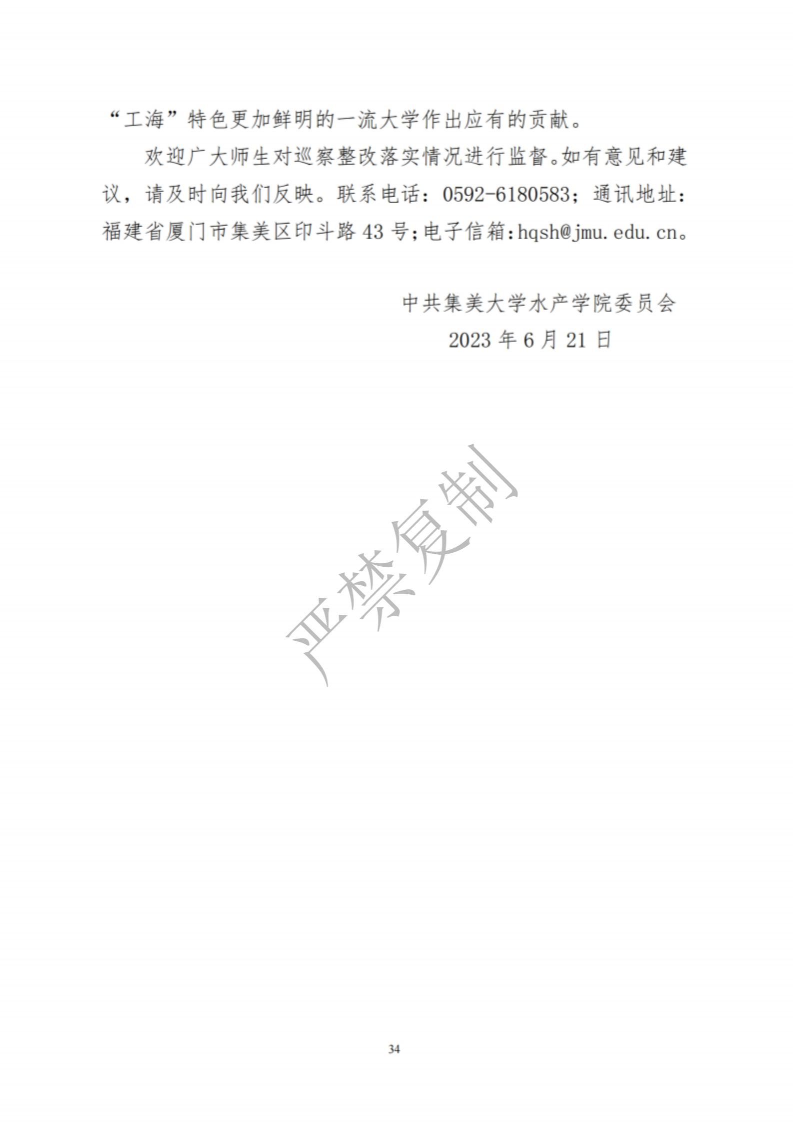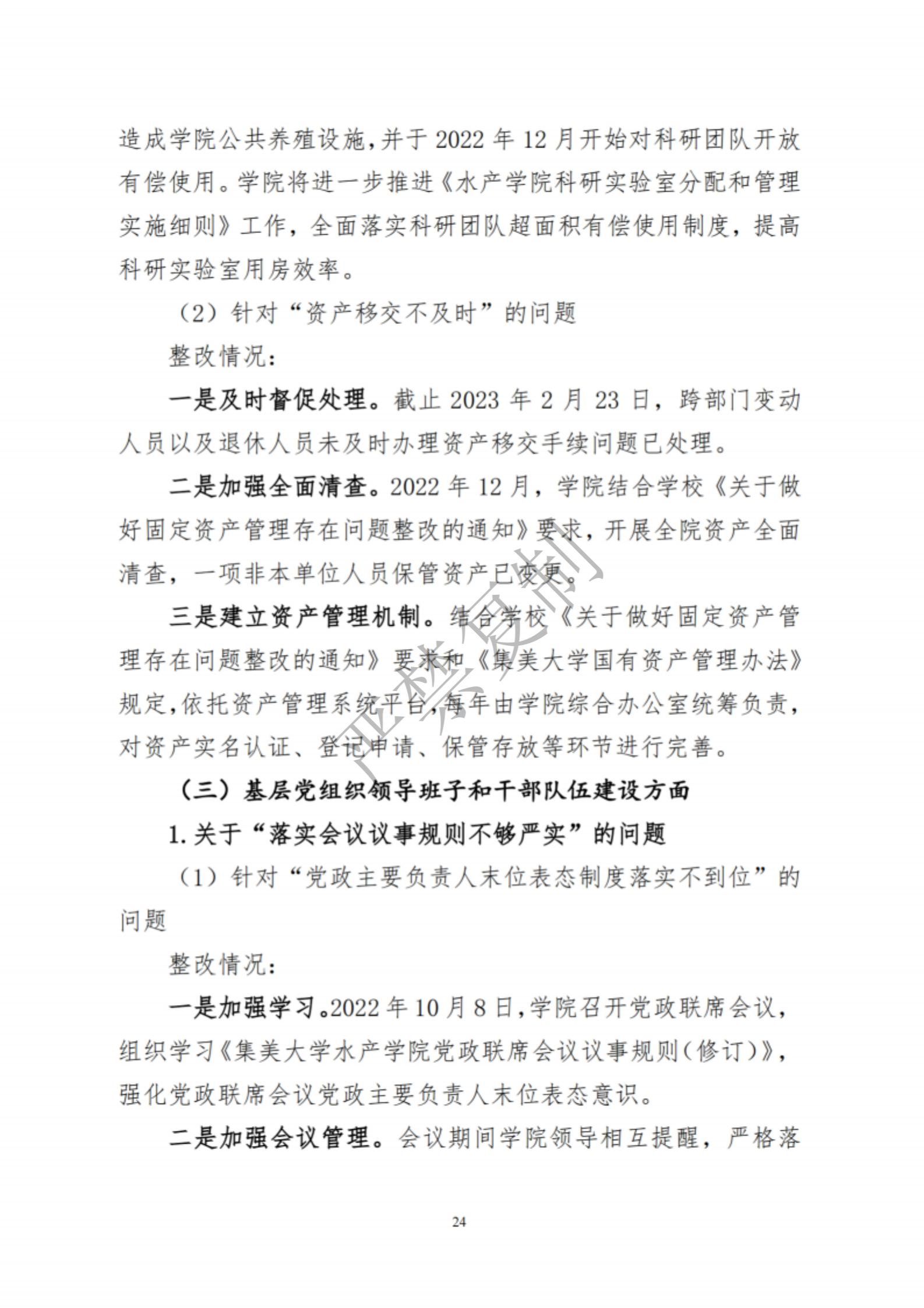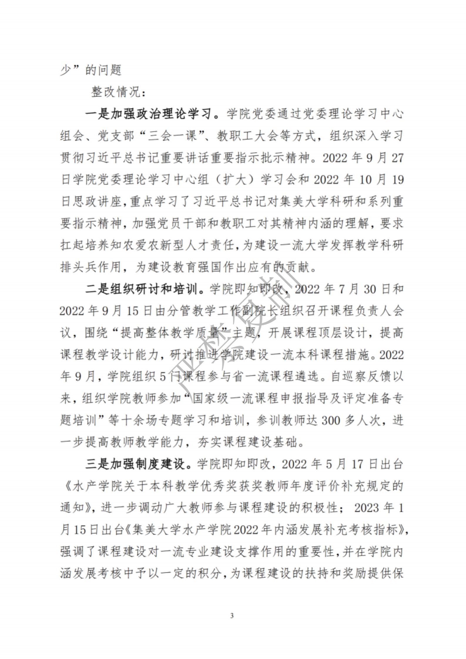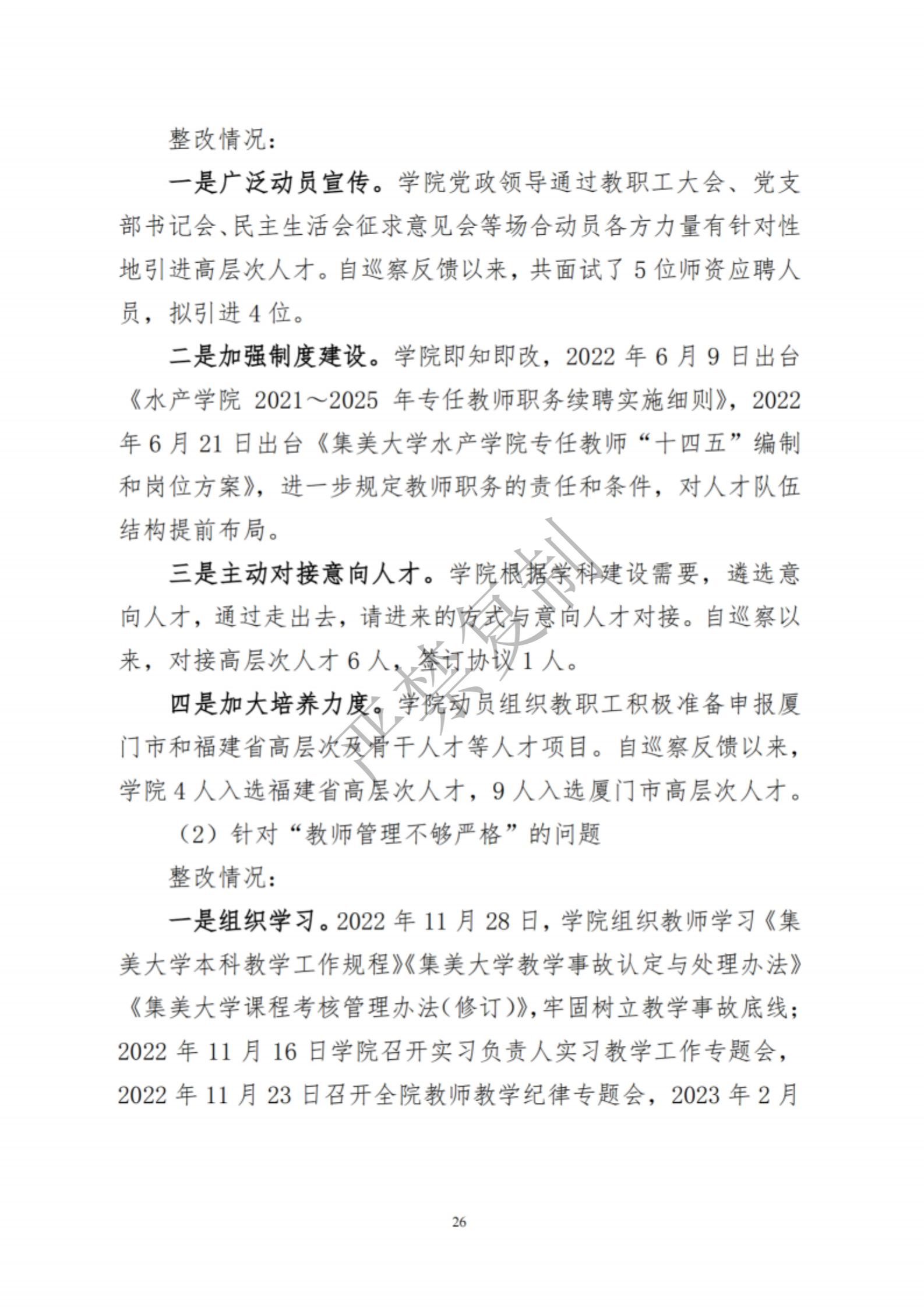 中共集美大学水产学院委员会关于巡察反馈意见集中整改进展情况的通报