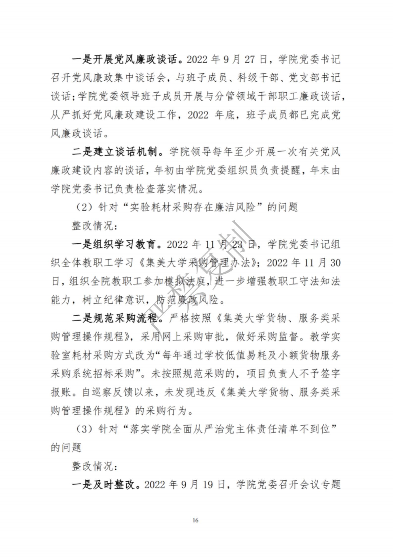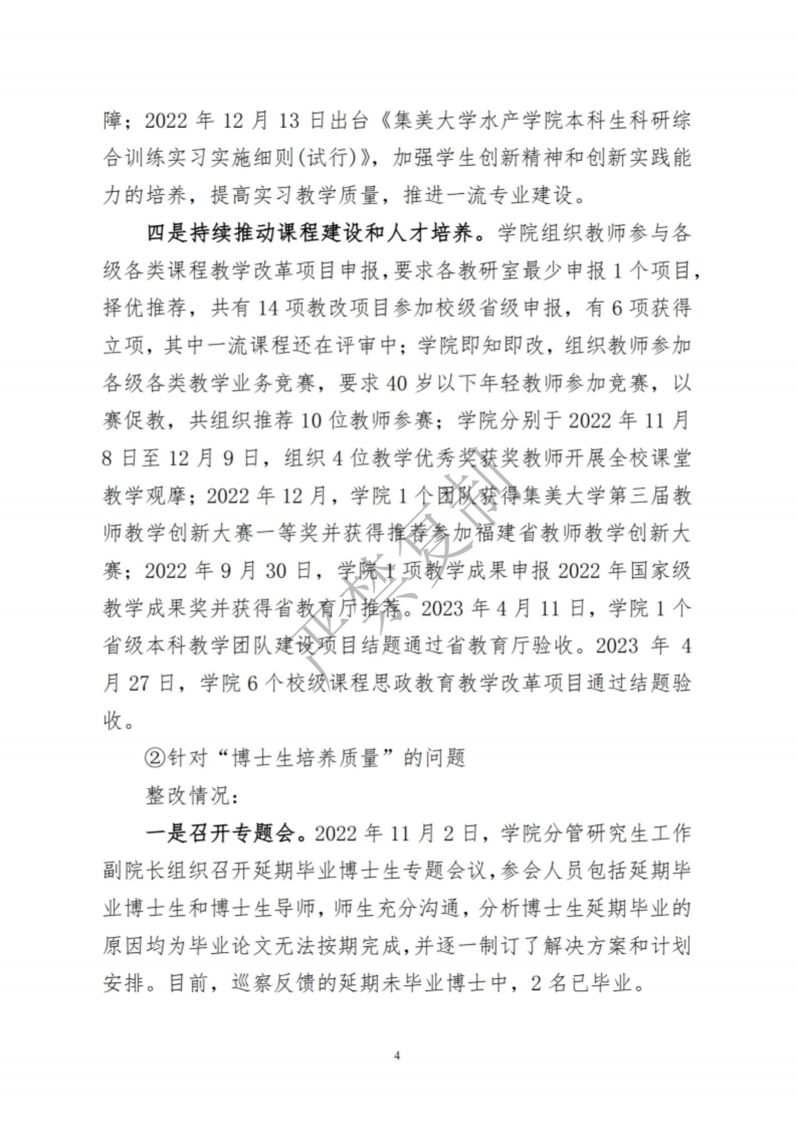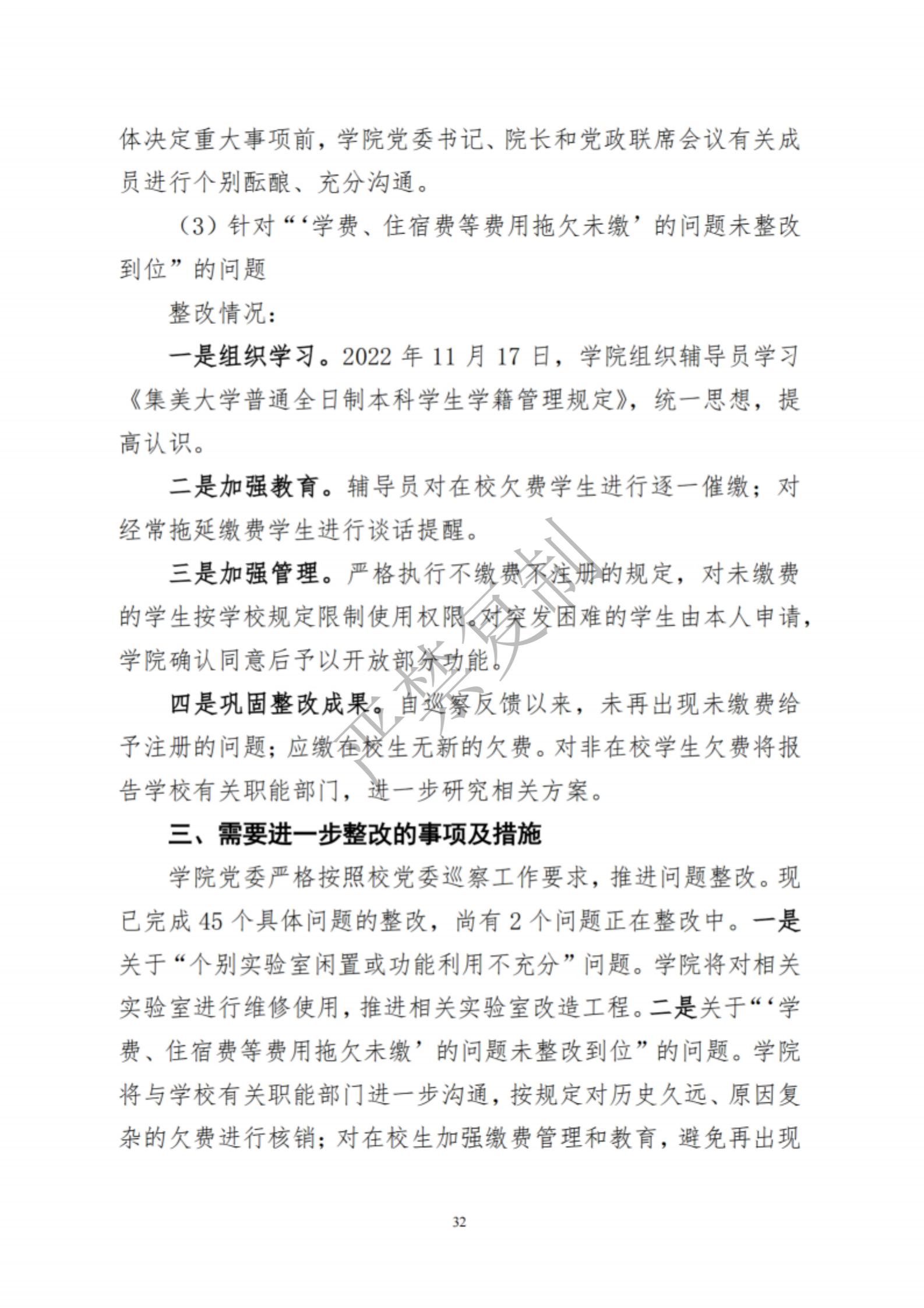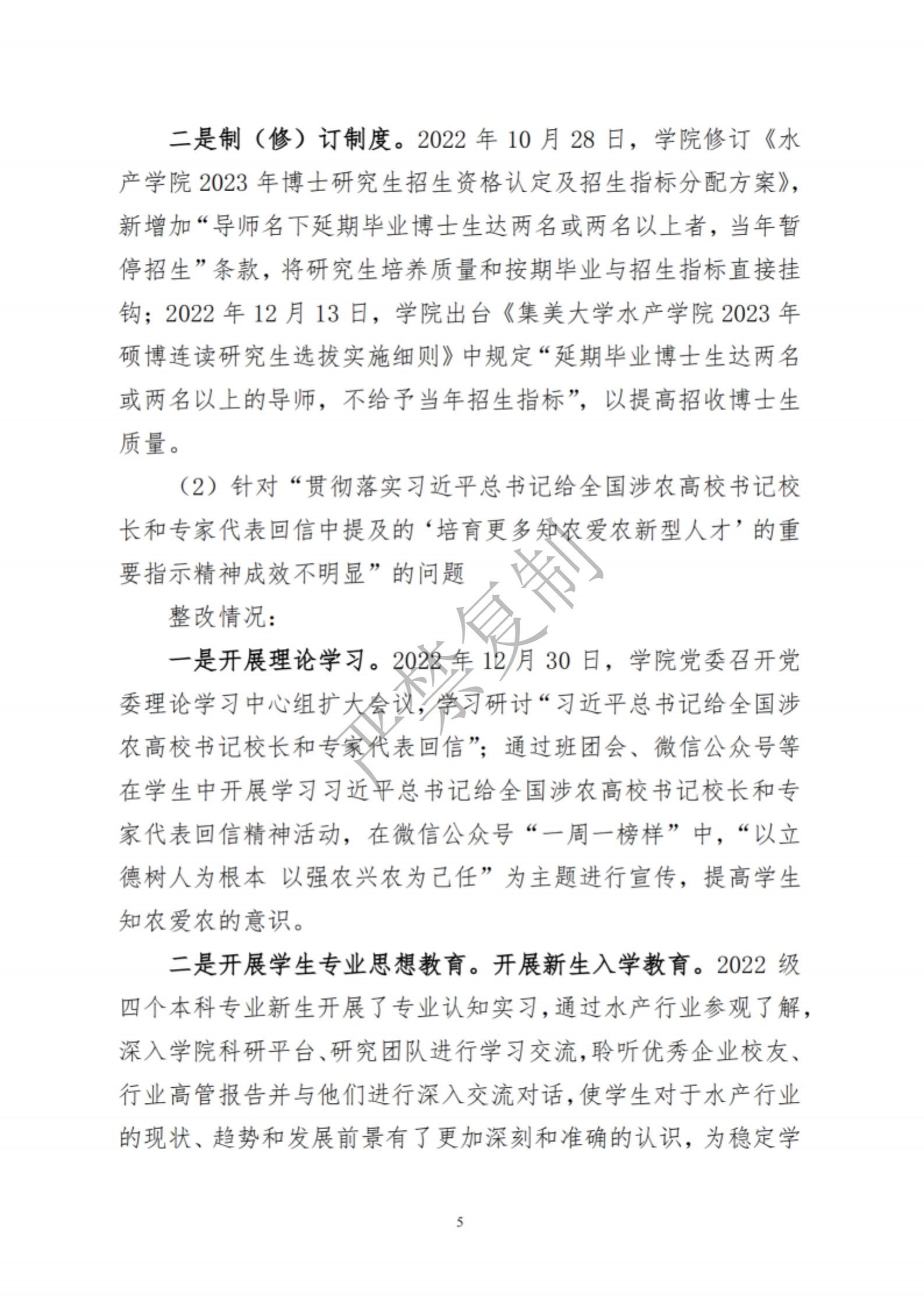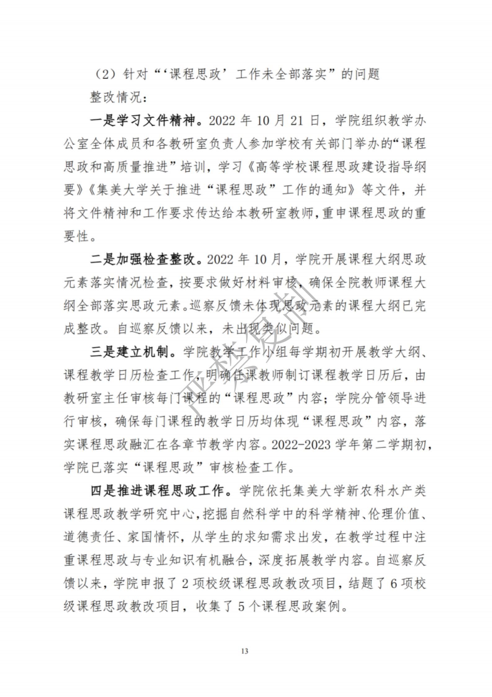 中共集美大学水产学院委员会关于巡察反馈意见集中整改进展情况的通报
