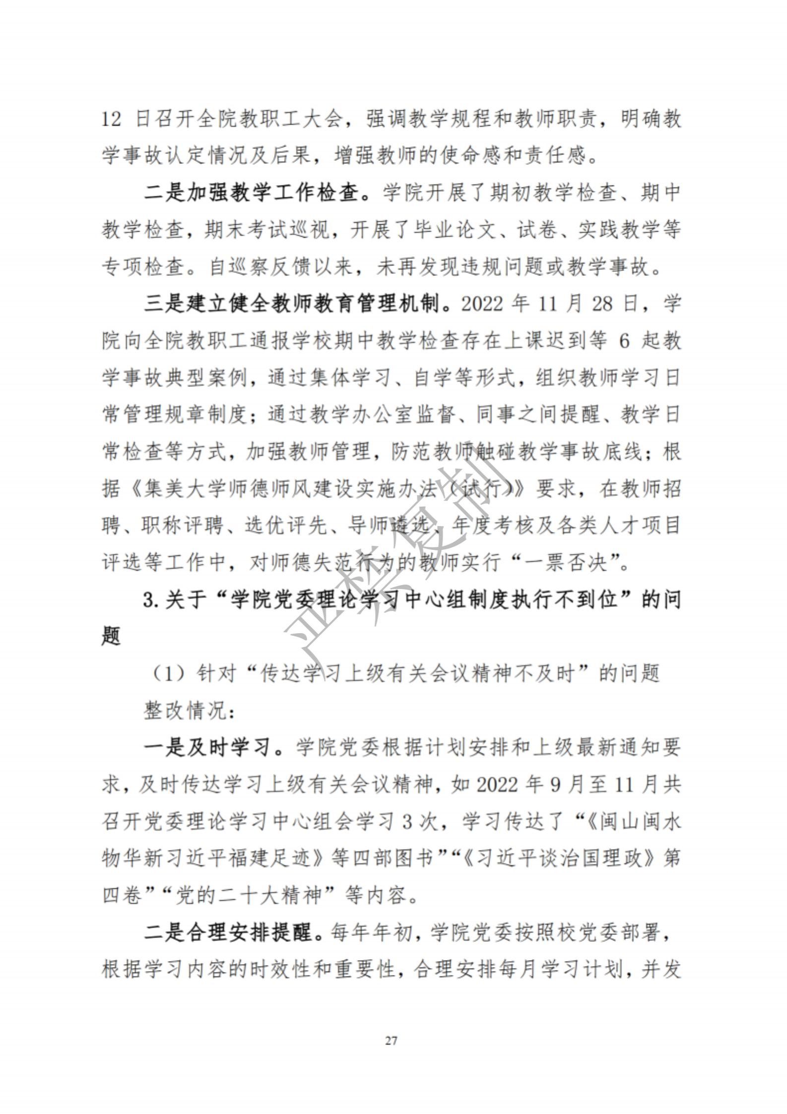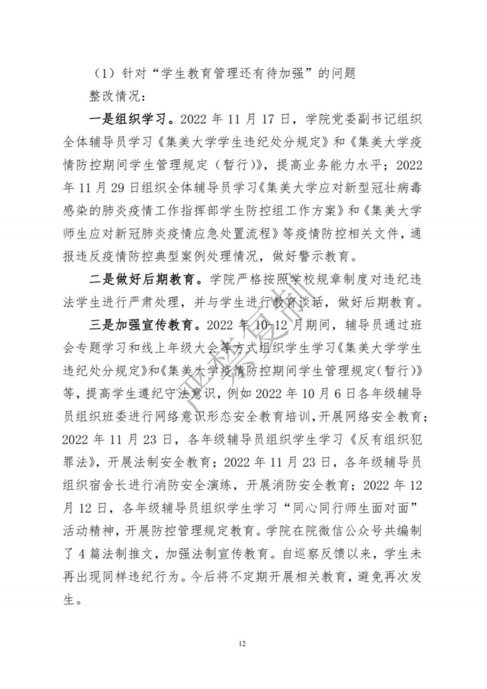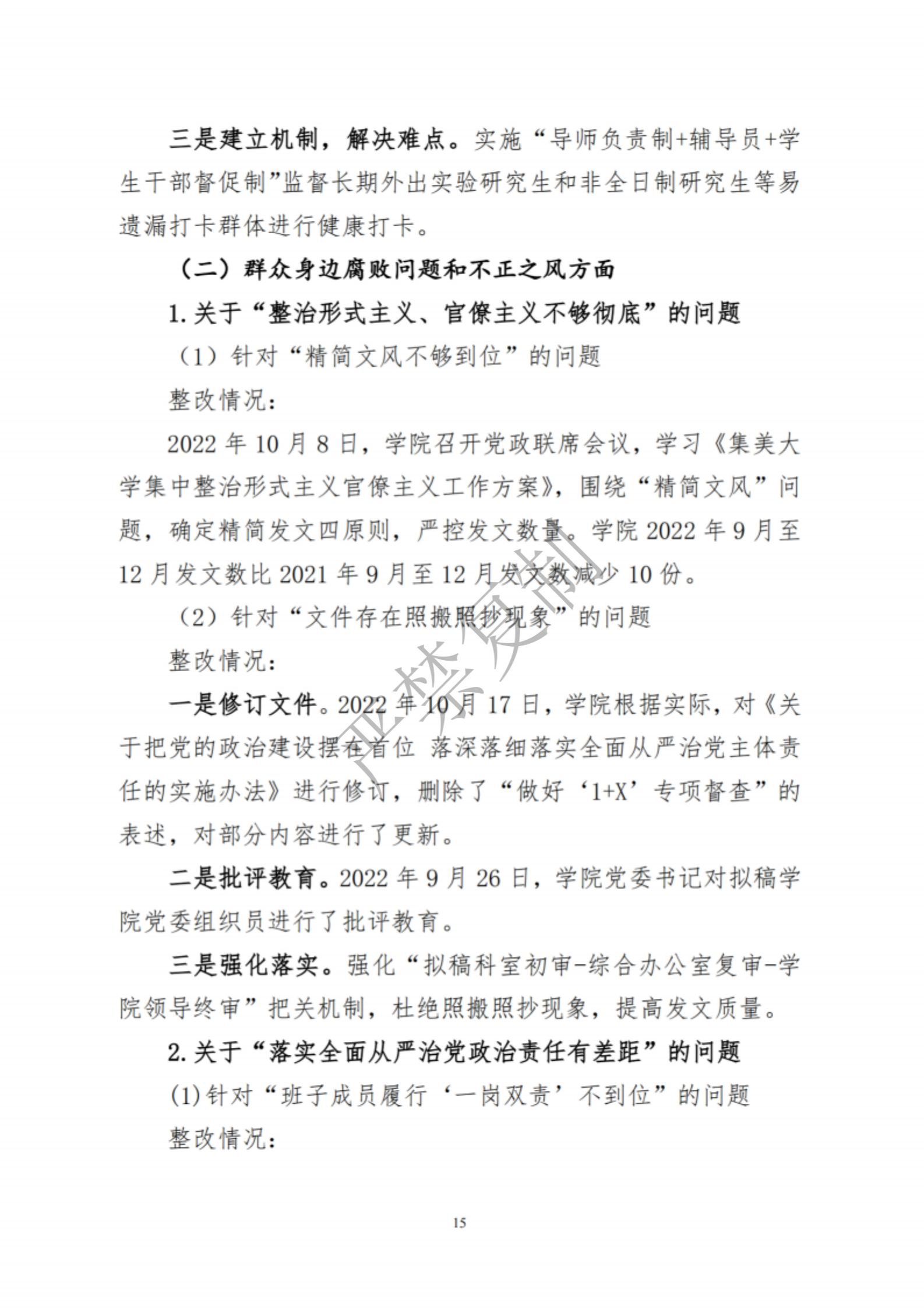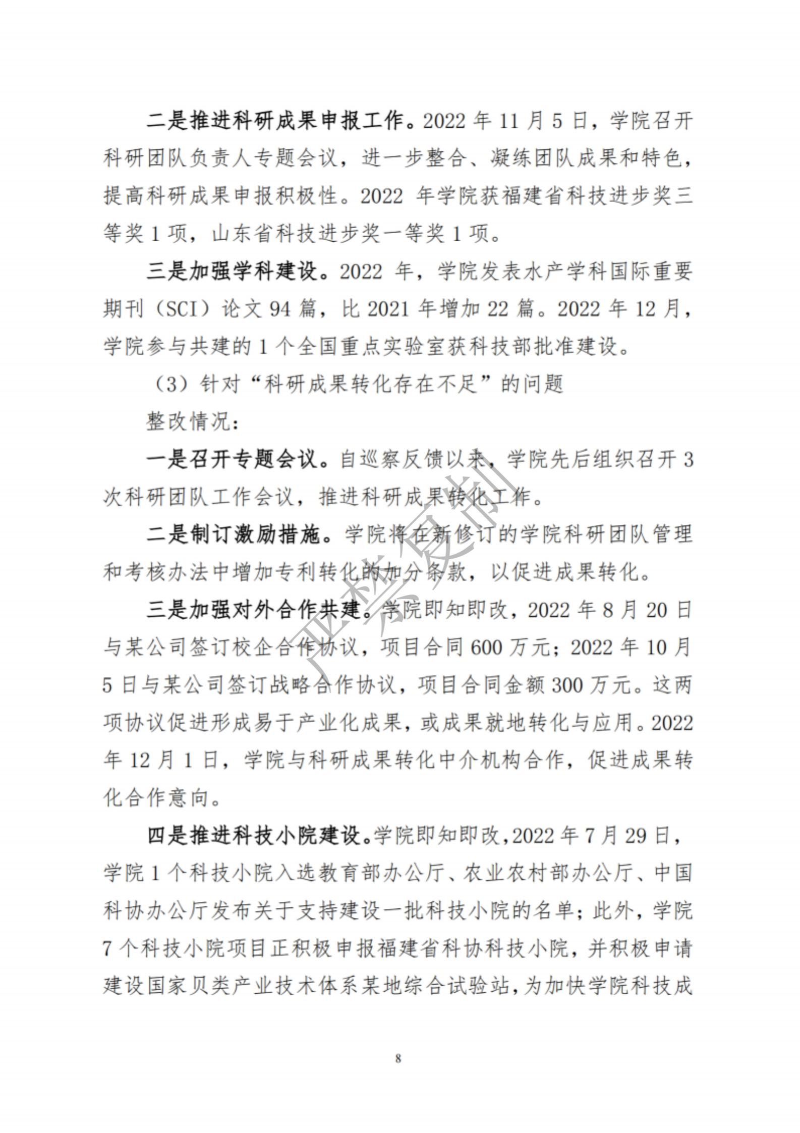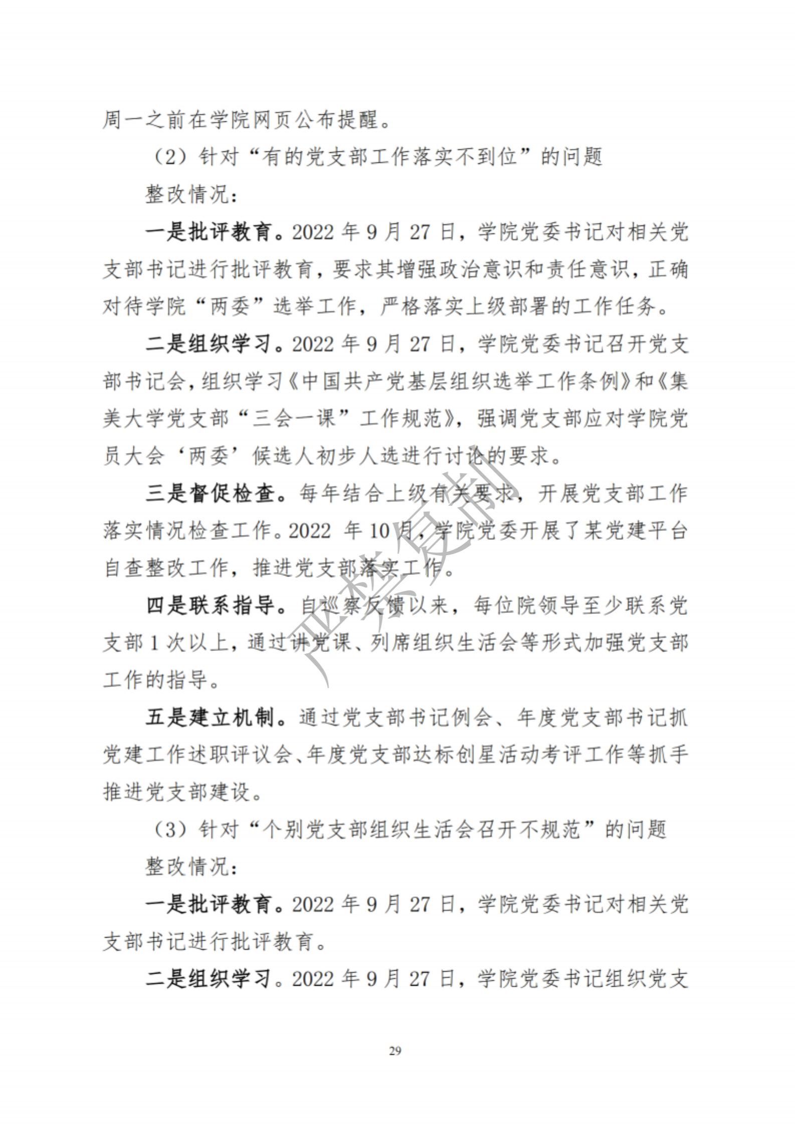 中共集美大学水产学院委员会关于巡察反馈意见集中整改进展情况的通报