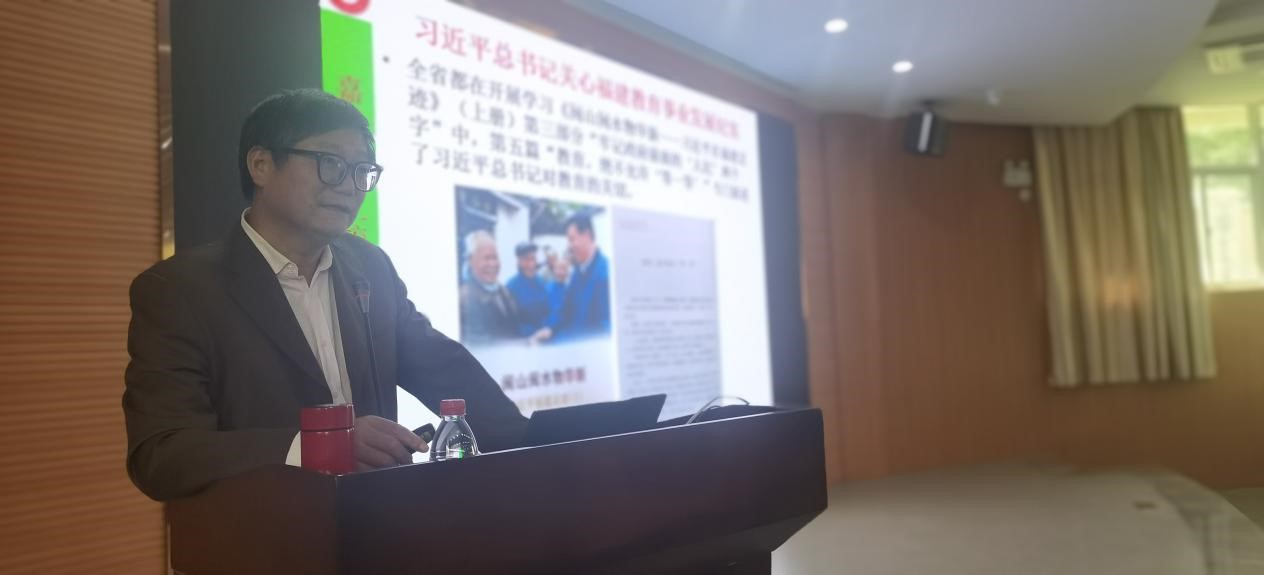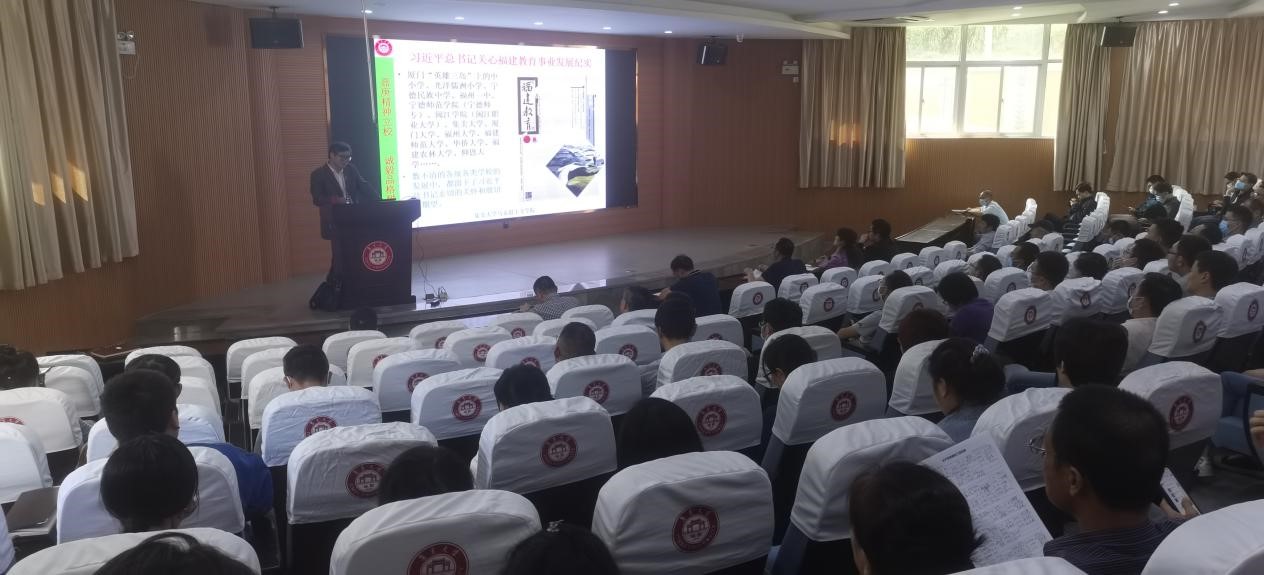 梅进禄提炼了《闽山闽水物华新——习近平在福建足迹》《习近平在厦门》《习近平在宁德》《习近平在福州》等书的有关章节,结合自己调研收集的材料,通过“始终如一的关怀”、“形式多样的关心”、“饱含真情的期望”三个方面,讲述了“习近平总书记在福建工作期间,无论在那个岗位,都始终关注教育问题,都在不断促进教育事业的发展”的一个个生动感人的故事,阐明了习近平总书记在福建工作时关于教育工作的重要理念、重大实践与党的十八大以来,习近平总书记就推动教育发展发表一系列重要讲话、作出一系列重要指示批示之间的联系。讲座材料详实,图文并茂,深入浅出,让在场教职工真切感受到习近平总书记对教育事业深切的关怀和殷切的期望,进一步深刻领悟了习近平总书记关于教育的重要论述。最后,黄海宏结合讲座内容,传达了学校2022年度科研工作推进会精神,要求全体教职工要深入贯彻落实习近平总书记对集美大学百年校庆贺信精神和系列重要指示精神,清醒认识学院存在的不足,敢于创新突破,争取大项目、大平台、大合作取得新突破,为建设一流大学发挥科研排头兵的作用,为建设教育强国、办好人民满意的教育作出应有的贡献。