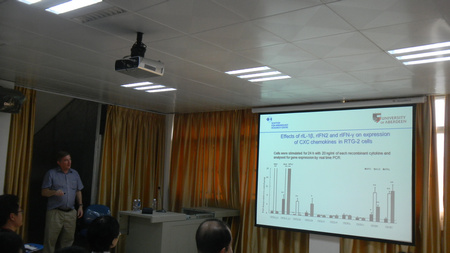 Christopher Secombes教授结合自身的研究方向,从介绍鲑鳟鱼的免疫系统,及免疫系统中的各种细胞因子在受到各种刺激后的变化等几方面向大家做了一场精彩的报告。在报告中,Christopher Secombes教授较为详细地讲述了免疫系统中的TNF一系列因子以及INF因子在受到LPS和VHSV等物质的刺激后表达量的变化,为大家研究鱼类的免疫系统提供了新的启发。讲座过程中,Christopher Secombes教授与我院老师、学生进行了充分的交流,会议学术气氛浓厚。
